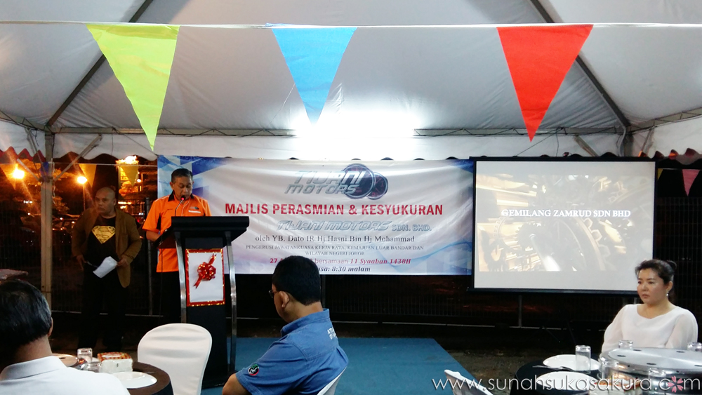 Majlis Perasmian & Kesyukuran Tijani Motors malam tadi dirasmikan oleh Pengerusi Jawatankuasa Kerja Raya, Kemajuan Luar Bandar dan Wilayah Negeri Johor, YB Datuk Ir Hj Hasni bin Hj Mohammad. Beliau menyatakan harapannya agar Tijani Motors akan terus menjadi syarikat yang maju dan berjaya di masa akan datang. YB Datuk juga menyatakan kefahaman kerajaan atas keperluan dan kecenderungan orang muda dalam bidang permotoran, di mana tapak 5 ekar akan dibina di utara Pontian untuk dijadikan sebagai racing track kereta dan motor oleh kerajaan negeri.